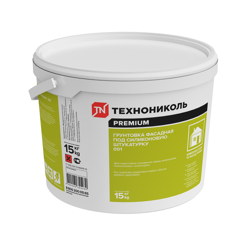 Грунтовка фасадная под силиконовую штукатурку ТЕХНОНИКОЛЬ 001 на основе водной дисперсии акриловой смолы, с добавлением кварцевой крошки, не содержит растворителей, стойкая к омылению, а также к воздействию атмосферных факторов.