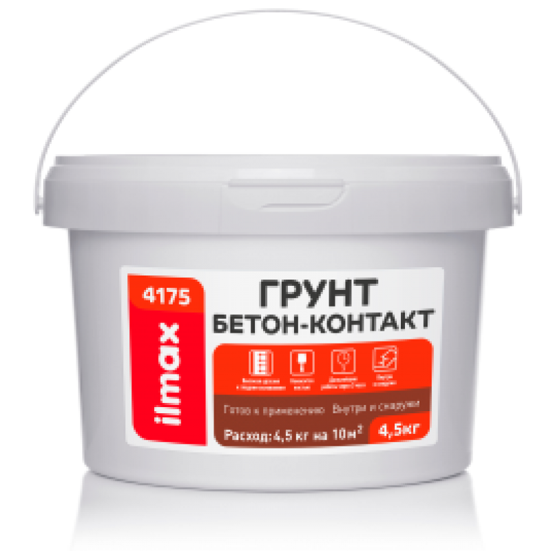 Грунтовка Ilmax 4175 beton-kontakt предназначен для создания контактной поверхности перед нанесением: выравнивающих штукатурок, клеевых смесей. Рекомендуется для нанесения на основания из: монолитного бетона, бетонных блоков и стен; мозаичных полов; плитки керамической и грес; прочных малярных покрытий; гипсокартона, стекломагнезитовых листов; плит OSB, ДСП.