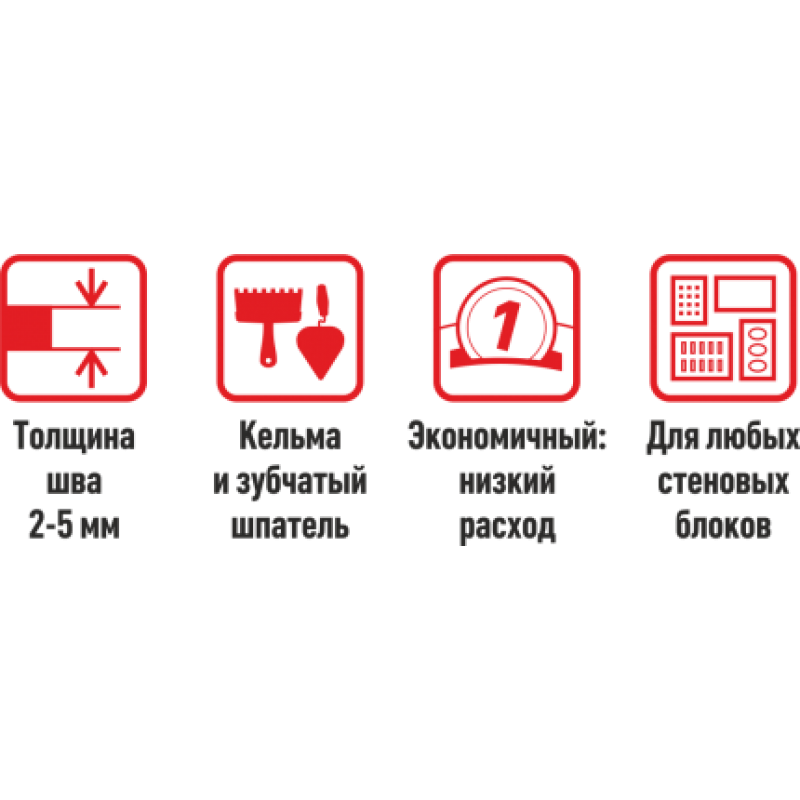 | Расход смеси: | 1,6...1,8 кг/м2/мм (около 25 кг. на 1 м3 блоков) |