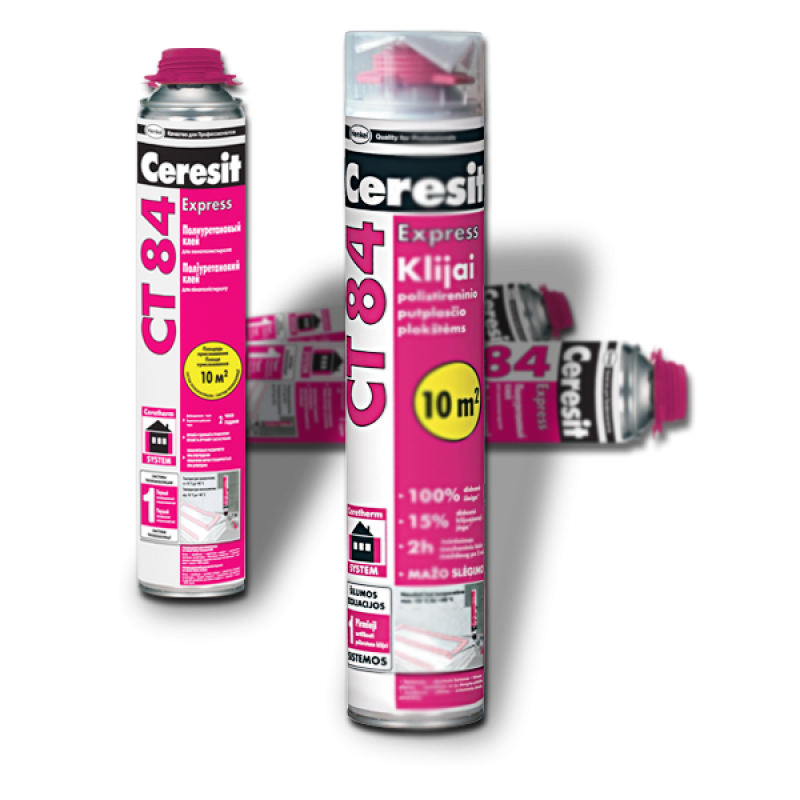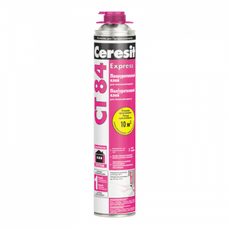 Полиуретановый клей Ceresit CT 84 Express предназначен для крепления плит из пенополистирола, в том числе экструдированного, на таких основаниях как бетон, цементные штукатурки, кирпичные кладки, дерево, плиты OSB, стекло, битумная гидроизоляция и т.д. при устройстве систем наружной теплоизоляции фасадов. Позволяет вести работы при температуре воздуха и основания от -10 ºС.