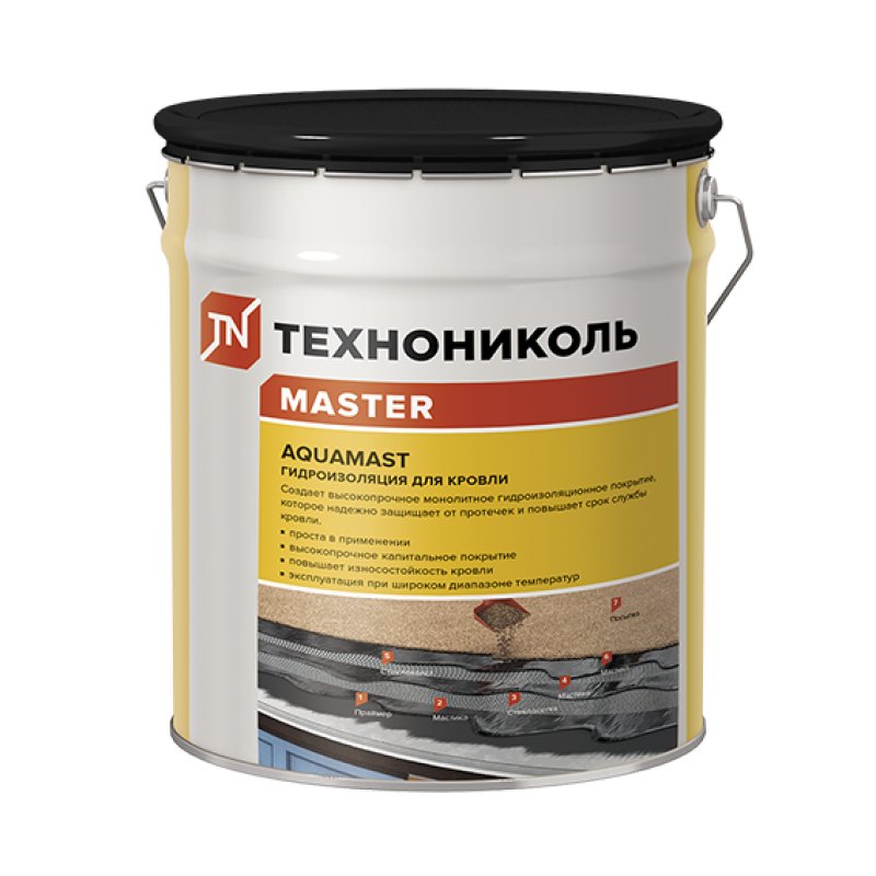 Мастика битумно-резиновая кровельная и гидроизоляционная битумнорезиновая холодная AquaMast представляет собой готовый к применению многокомпонентный материал, состоящий из нефтяного битума, модифицированного дробленой резиной, технологических добавок, минеральных наполнителей и органического растворителя.Применение: