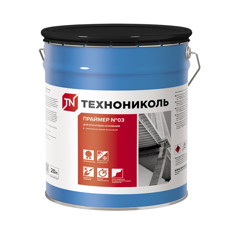 Праймер битумно-полимерный ТЕХНОНИКОЛЬ №03 представляет собой раствор нефтяного битума, полимеров и адгезионных добавок в органических растворителях.