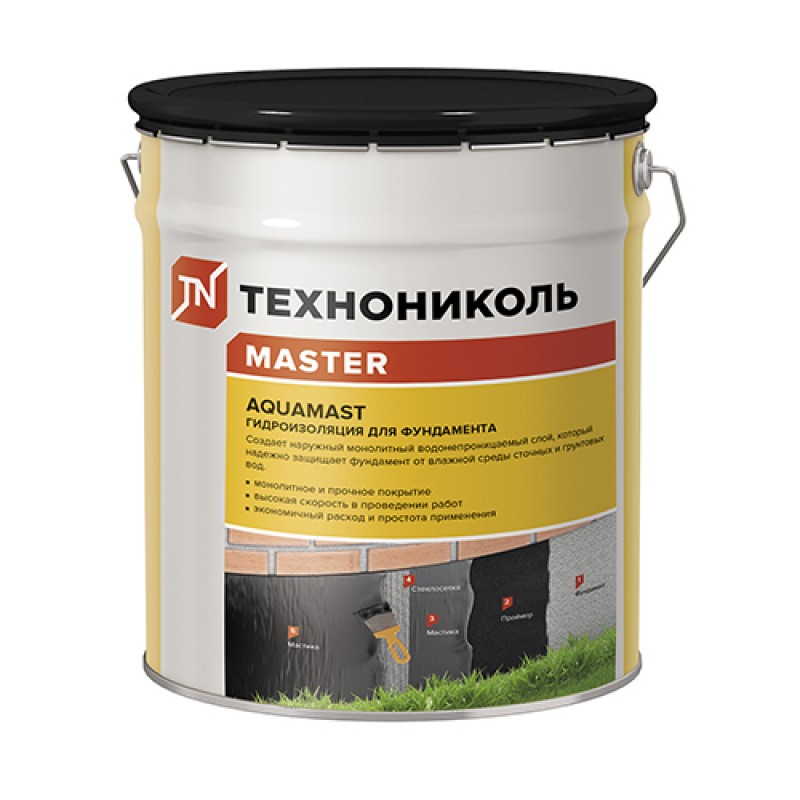 Мастика гидроизоляционная битумная для фундаментов AquaMast (АкваМаст) представляет собой полностью готовый к применению материал на основе нефтяного битума, содержащий технологические добавки, минеральные наполнители и растворитель. Предназначена для обмазочной гидроизоляции конструкций (бетонных, железобетонных, металлических, деревянных и др.), заглубляемых в землю и контактирующих с влажной средой: фундаментов, свай и пр.
