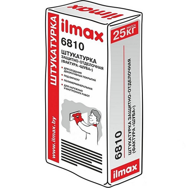Штукатурка защитно-отделочная фасадная (фактура «шуба») Ilmax 6810 - смесь применяется для наружных и внутренних отделочных работ, наносится по минеральным поверхностям (утеплителям). Предназначена для создания декоративных тонкослойных штукатурных слоев с рельефно-выраженной фактурой «шуба». Используется как элемент декоративно-защитного слоя в легких штукатурных системах фасадного утепления.