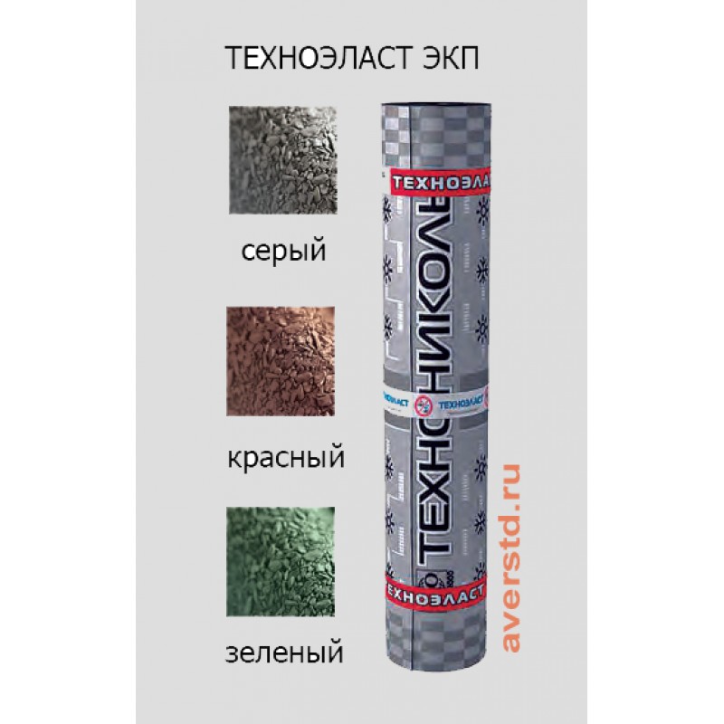 Техноэласт ЭКП – рулонный битумно-полимерный кровельный и гидроизоляционный материал. Имеет армирующую основу полиэстер (Э) и нанесенное, с двух сторон, битумно-полимерное вяжущее, в состав которого входит полимер СБС (стирол-бутадиен-стирол - искусственный каучук), который придает материалу улучшенную эластичность при отрицательных температурах, что позволяет производить работы при минусовых температурах, улучшает эксплуатационные свойства и увеличивает срок службы материала. С наружной стороны Техноэласт ЭКП имеет защитное покрытие (К) из крупнозернистой посыпки кровельный сланец (цвет: серый). С нижней, наплавляемой стороны – оплавляемая полимерная пленка (П). Используется во всех климатических районах по СНиП 23-01. Производится на заводах Корпорации ТехноНИКОЛЬ, верхний слой материала Техноэласт.