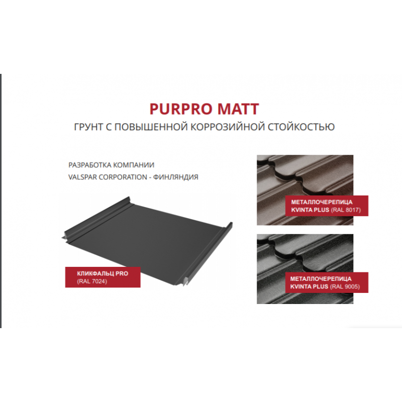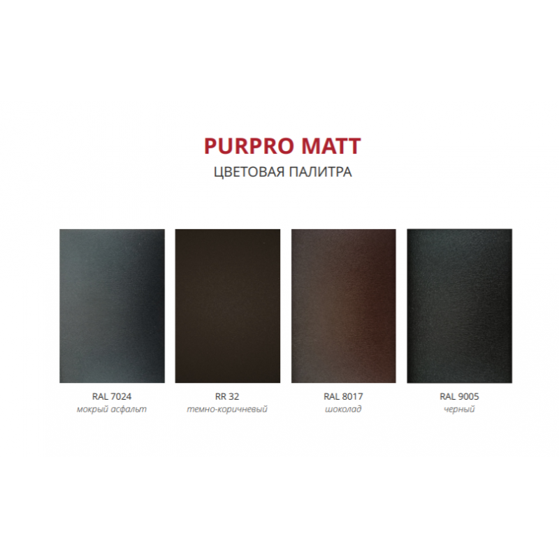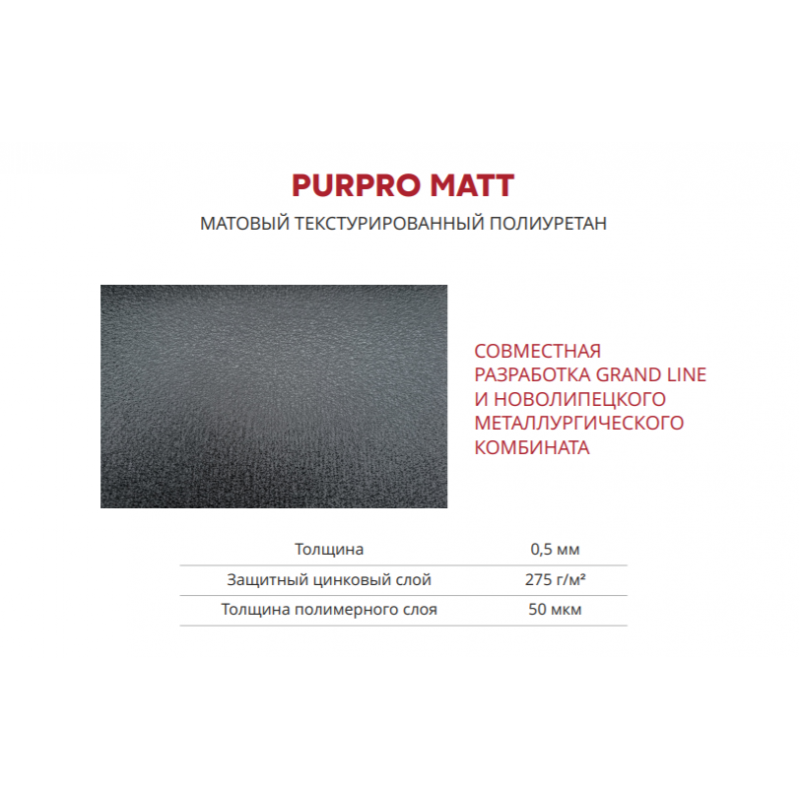 PurPro Matt - это новинка 2021 года, представляет собой матовое полиуретановое покрытие толщиной 50 мкм, с цинком 275 г/м2 с выраженной матовой текстурой. Это новейшее покрытие является совместной разработкой Новолипецкого металлургического комбината и Sherwin-Williams (Финляндия). Покрытие ПуреПро Матт (PurPro Matt ) 275 RAL 7024 мокрый асфальт обеспечивает кровельному покрытию максимально долгий срок службы (от 35 лет) и придает неповторимый эстетический вид, который с явным преимуществом выделяется на фоне других типов покрытий металлочерепицы.